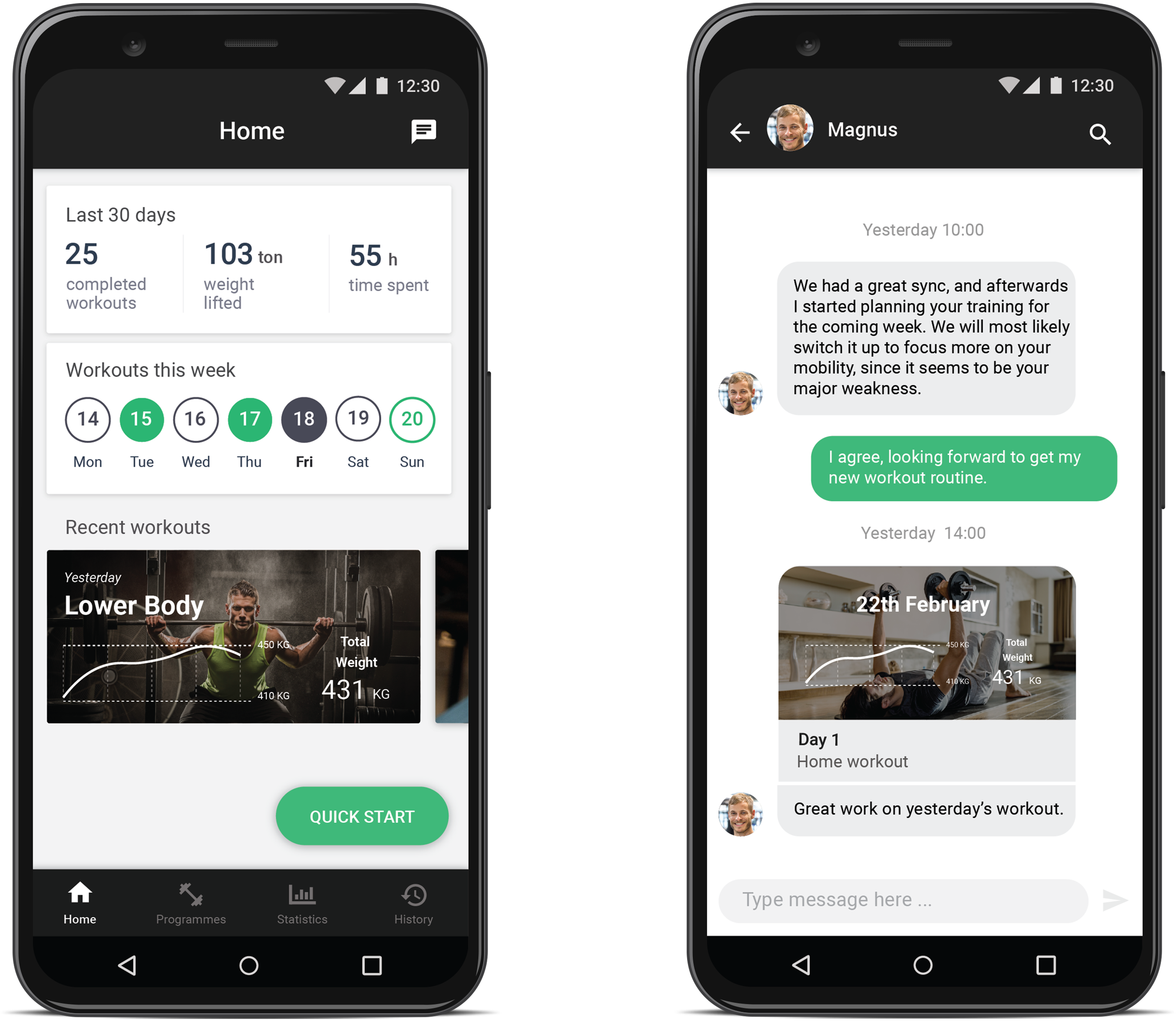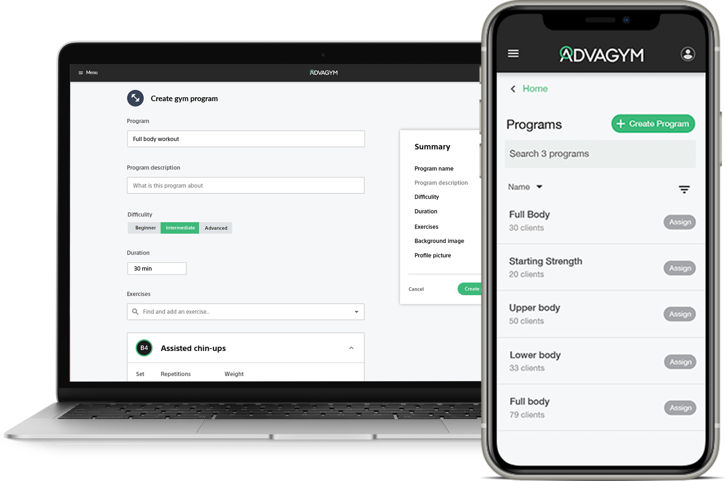 The heart of Advagym, interacting with the user before, during and after their workout, at the gym or at home. At the gym, the app makes it easy to log machine training, free weight training and cardio. Members can train using their own training programs, or get inspired by classes, exercises and programs published by your gym. Personal trainers can provide programs, coaching and detailed workout instructions.