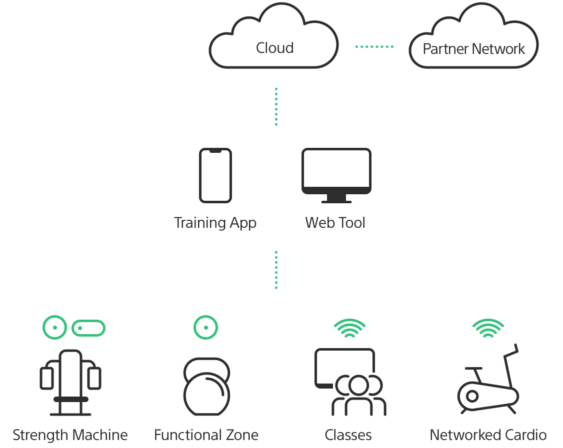 The Advagym solution consists of connected hardware sensors in the gym, a cloud backend, and apps for users and staff. Hardware and software are designed to interact seamlessly, creating a smooth user experience at the gym and beyond. Retrofitting on your existing machines and system setup is done in a matter of hours, and the only requirement on your gym is a working Wi-Fi network.
